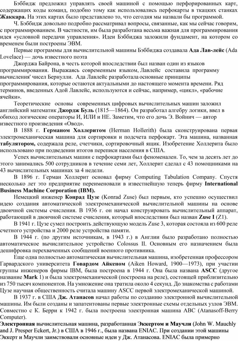 Джорджа Байрона, в честь которой впоследствии был назван один из языков программирования. Выражаясь современным языком, Лавлейс составила программу вычисления' чисел Бернулли. Ада Лавлейс разработала основные принципы программирования, которые остаются актуальными до настоящего момента времени. Ряд терминов, введенных Адой Лавлейс, используются и сейчас, например, «цикл», «рабочие ячейки».