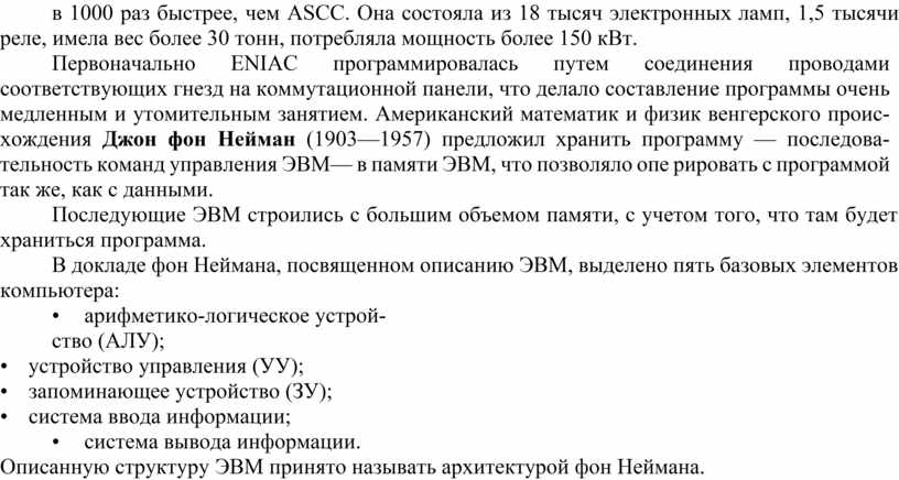 В докладе фон Неймана, посвященном описанию ЭВМ, выделено пять базовых элементов компьютера:
