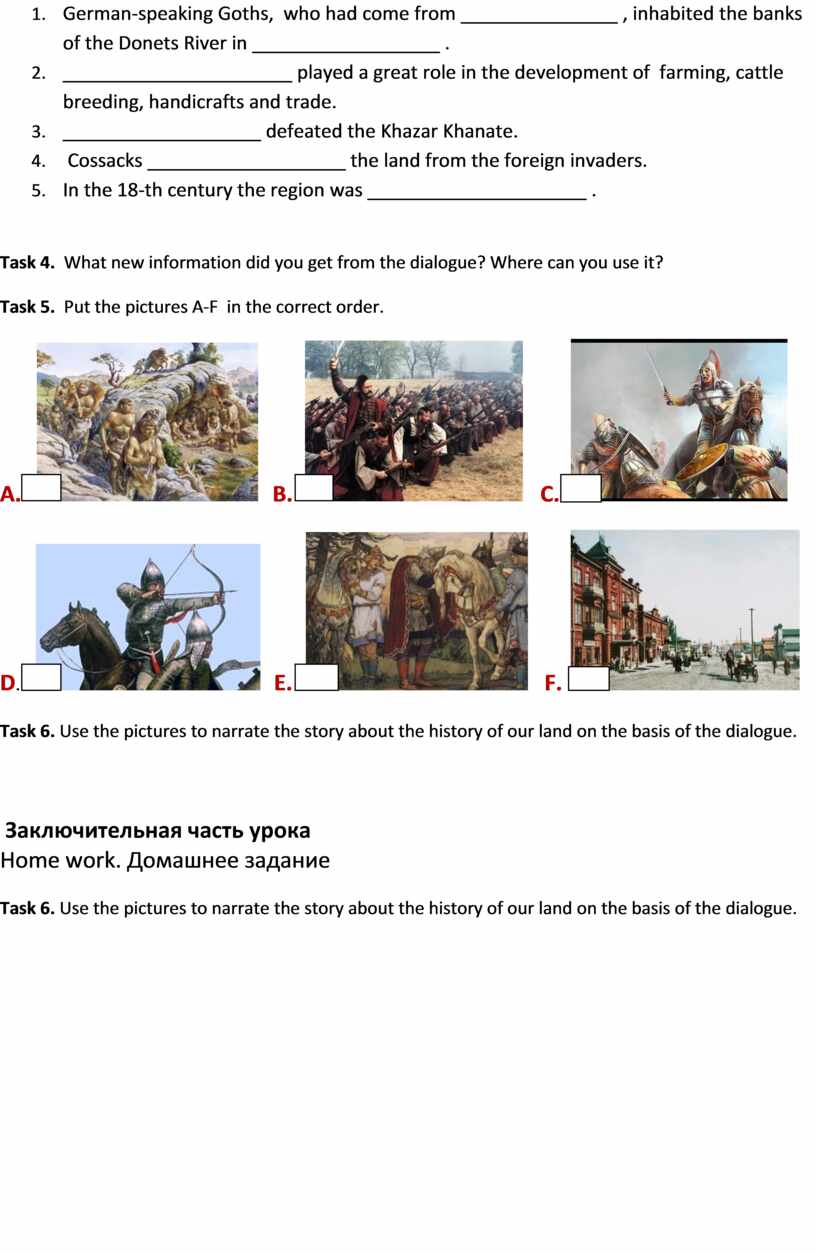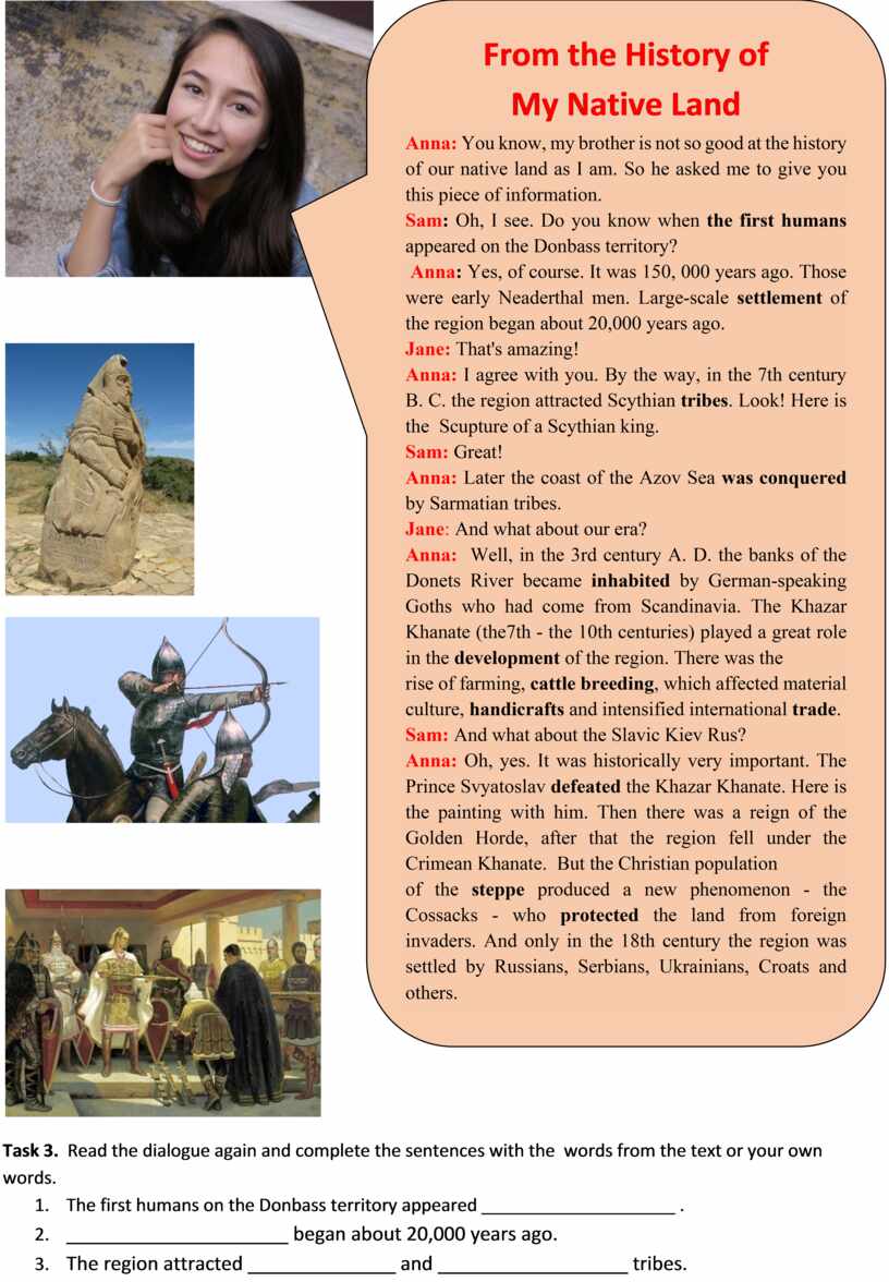 Task 6. Use the pictures to narrate the story about the history of our land on the basis of the dialogue.