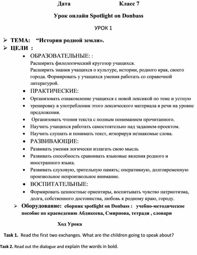 Ø Оборудование: сборник spotlight on Donbass : учебно-методическое пособие по краеведению Абдикеева, Смирнова, тетради , словари