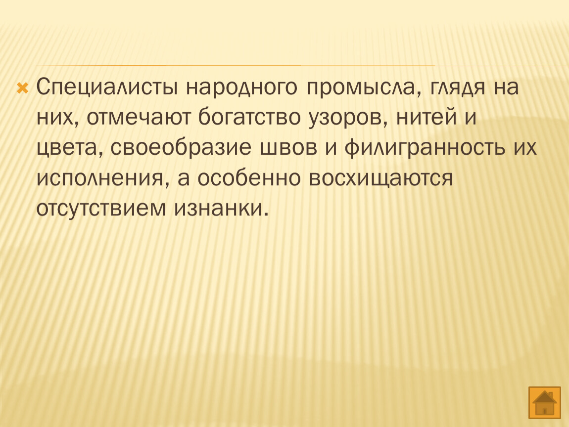 Специалисты народного промысла, глядя на них, отмечают богатство узоров, нитей и цвета, своеобразие швов и филигранность их исполнения, а особенно восхищаются отсутствием изнанки.