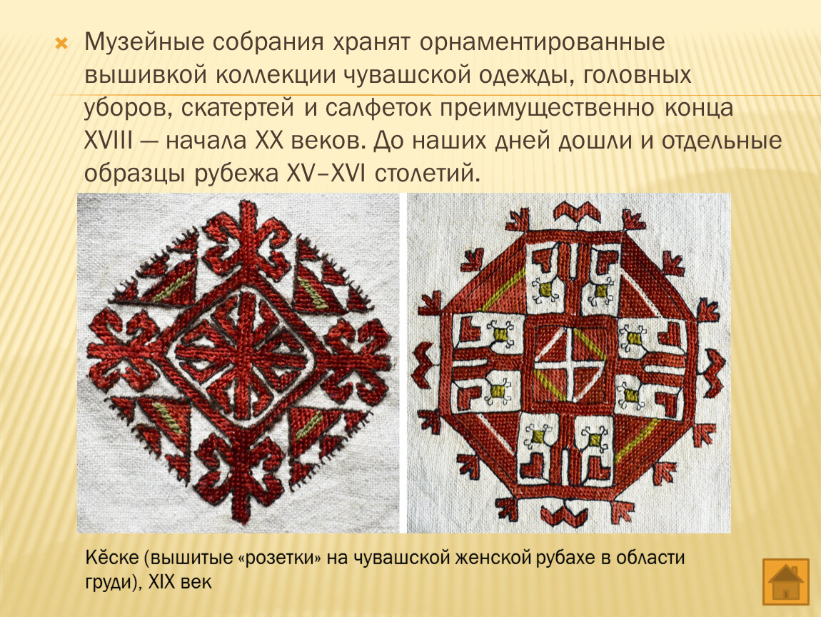 Музейные собрания хранят орнаментированные вышивкой коллекции чувашской одежды, головных уборов, скатертей и салфеток преимущественно конца XVIII — начала XX веков. До наших дней дошли и отдельные образцы рубежа XV–XVI столетий.