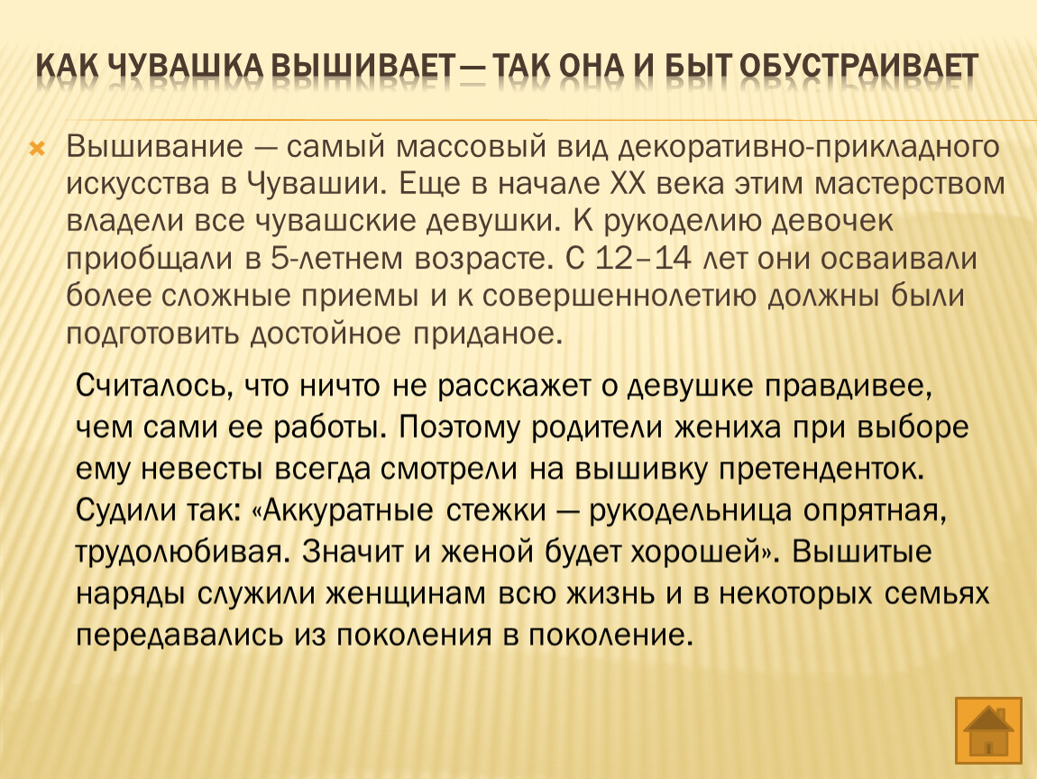 Слайд7……….. Как чувашка вышивает — так она и быт обустраивает