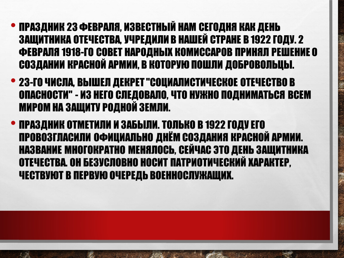 Праздник отметили и забыли. Только в 1922 году его провозгласили официально Днём создания Красной армии. Название многократно менялось, сейчас это День защитника Отечества. Он безусловно носит патриотический характер, чествуют в первую очередь военнослужащих.