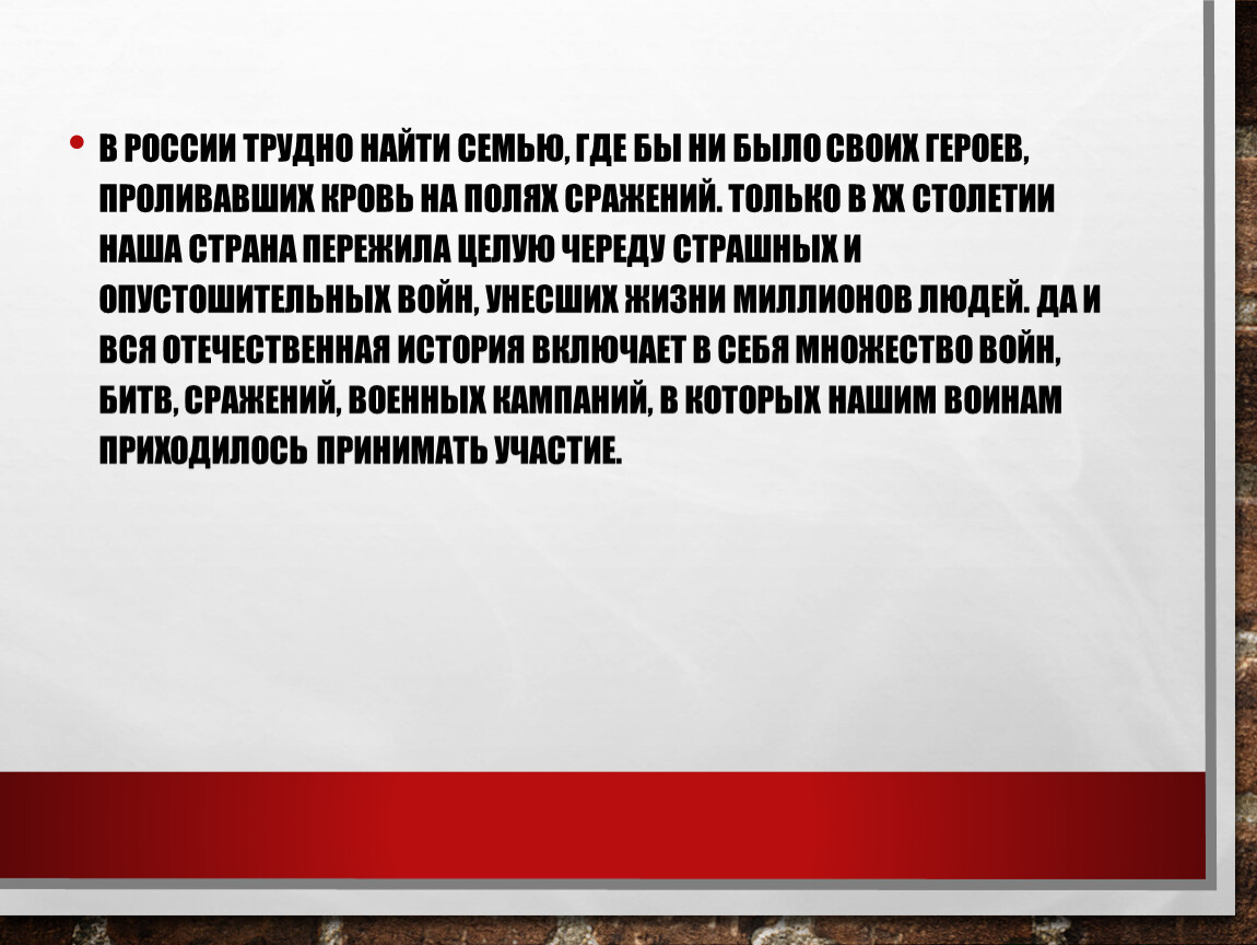 В России трудно найти семью, где бы ни было своих героев, проливавших кровь на полях сражений. Только в XX столетии наша страна пережила целую череду страшных и опустошительных войн, унесших жизни миллионов людей. Да и вся отечественная история включает в себя множество войн, битв, сражений, военных кампаний, в которых нашим воинам приходилось принимать участие.