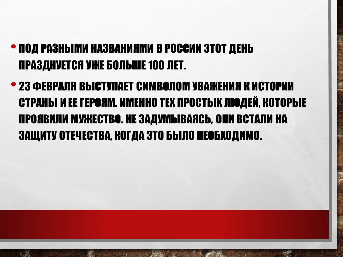 23 февраля выступает символом уважения к истории страны и ее героям. Именно тех простых людей, которые проявили мужество. Не задумываясь, они встали на защиту Отечества, когда это было необходимо.