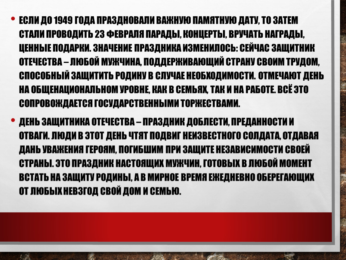если до 1949 года праздновали важную памятную дату, то затем стали проводить 23 февраля парады, концерты, вручать награды, ценные подарки. Значение праздника изменилось: сейчас защитник Отечества – любой мужчина, поддерживающий страну своим трудом, способный защитить Родину в случае необходимости. Отмечают день на общенациональном уровне, как в семьях, так и на работе. Всё это сопровождается государственными торжествами.