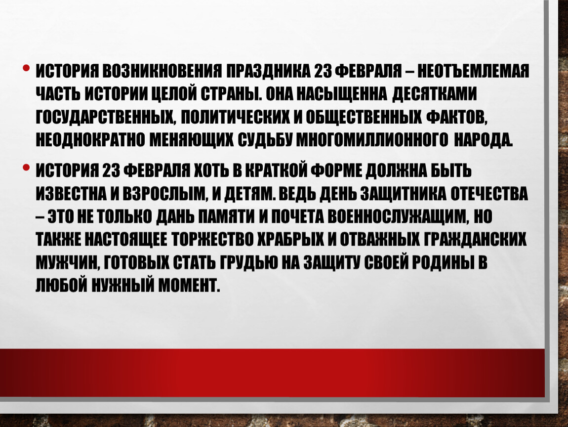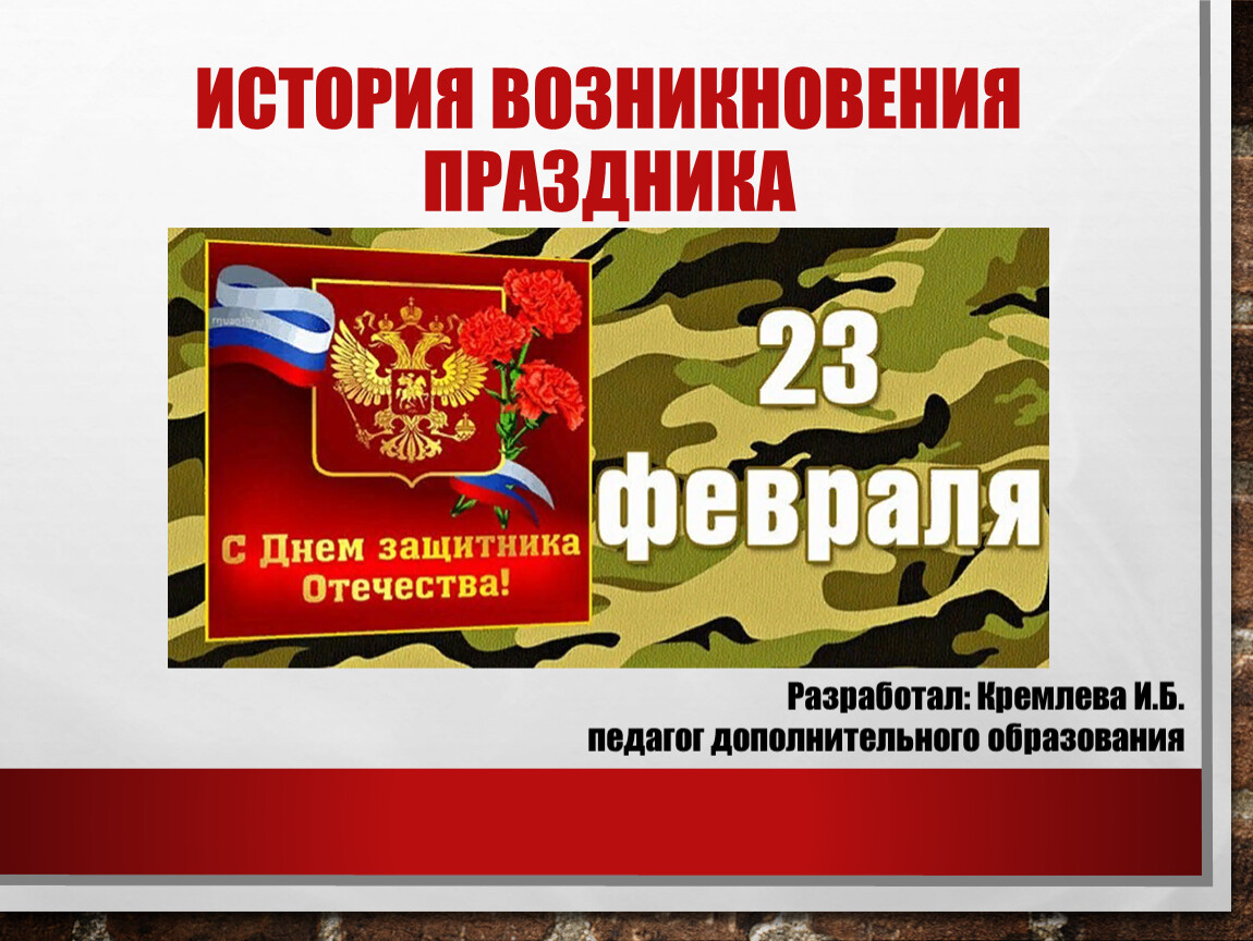 История возникновения праздника 23 февраля – неотъемлемая часть истории целой страны. Она насыщенна десятками государственных, политических и общественных фактов, неоднократно меняющих судьбу многомиллионного народа.