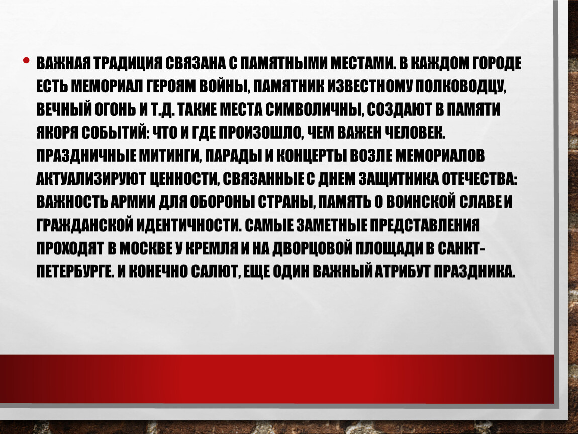 Важная традиция связана с памятными местами. В каждом городе есть мемориал героям войны, памятник известному полководцу, вечный огонь и т.д. Такие места символичны, создают в памяти якоря событий: что и где произошло, чем важен человек. Праздничные митинги, парады и концерты возле мемориалов актуализируют ценности, связанные с Днем защитника Отечества: важность армии для обороны страны, память о воинской славе и гражданской идентичности. Самые заметные представления проходят в Москве у Кремля и на Дворцовой площади в Санкт-Петербурге. И конечно салют, еще один важный атрибут праздника.