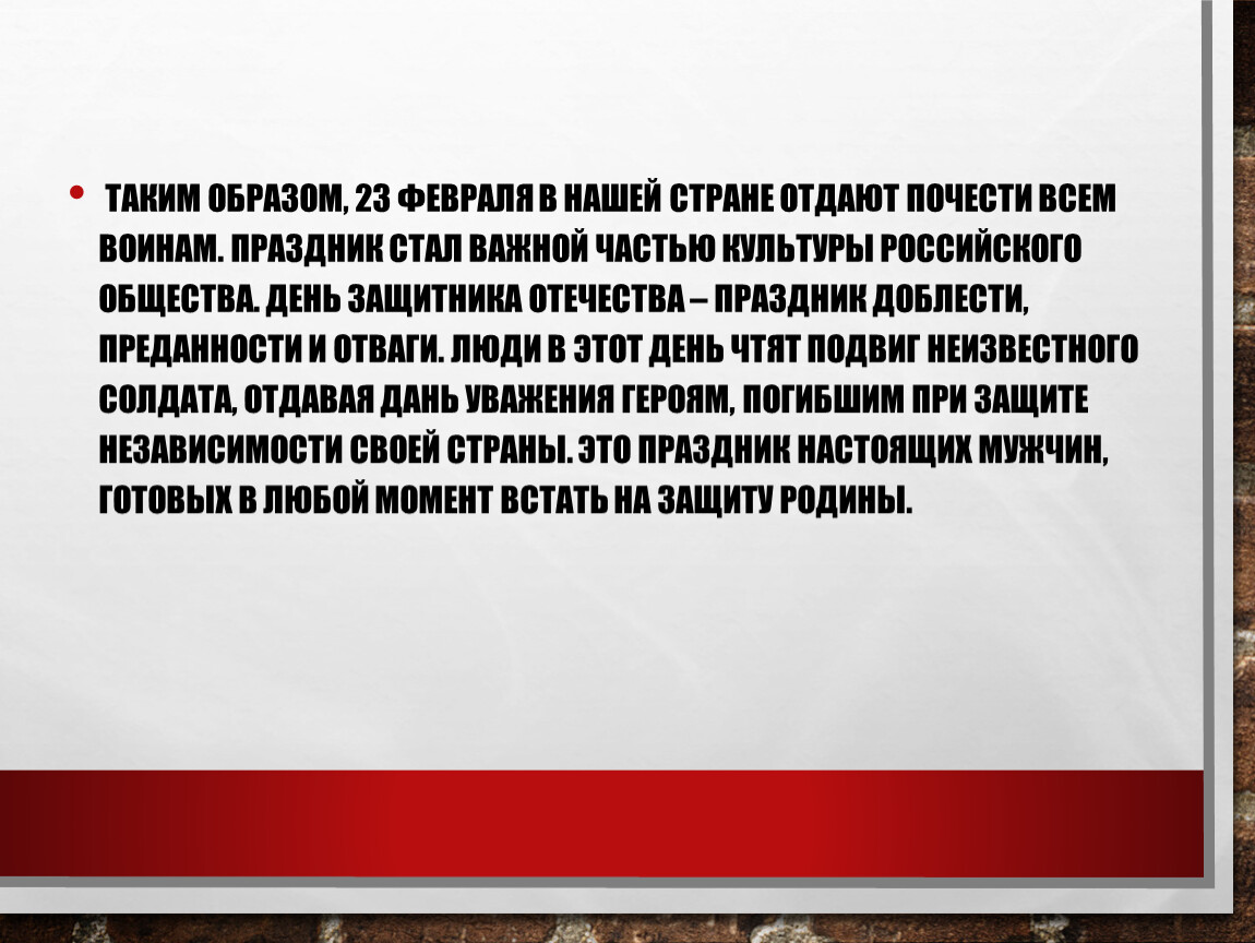 Таким образом, 23 февраля в нашей стране отдают почести всем воинам. Праздник стал важной частью культуры российского общества. День защитника Отечества – праздник доблести, преданности и отваги. Люди в этот день чтят подвиг неизвестного солдата, отдавая дань уважения героям, погибшим при защите независимости своей страны. Это праздник настоящих мужчин, готовых в любой момент встать на защиту Родины.