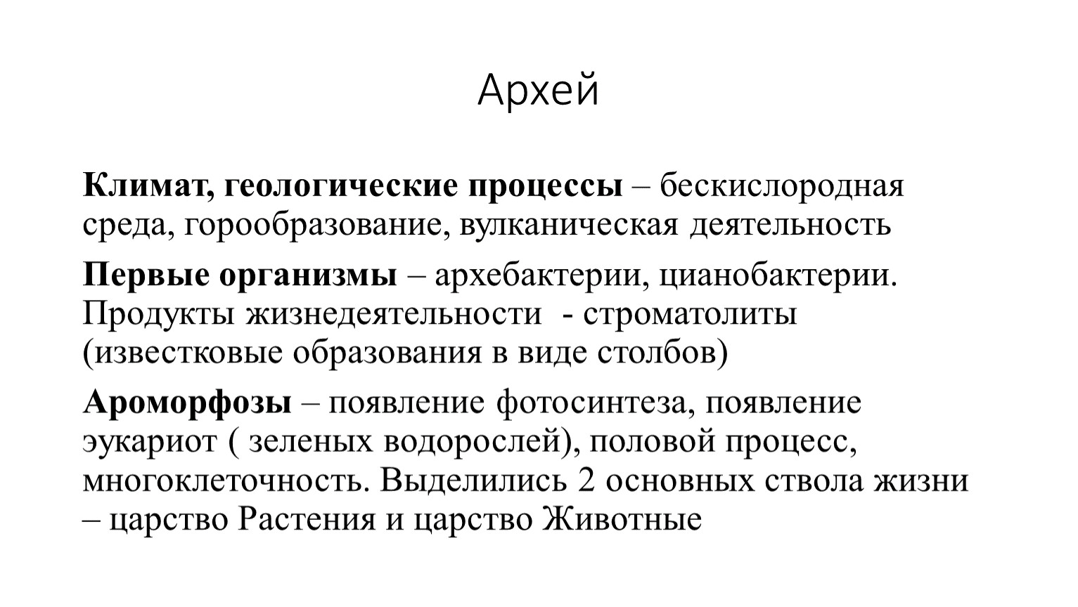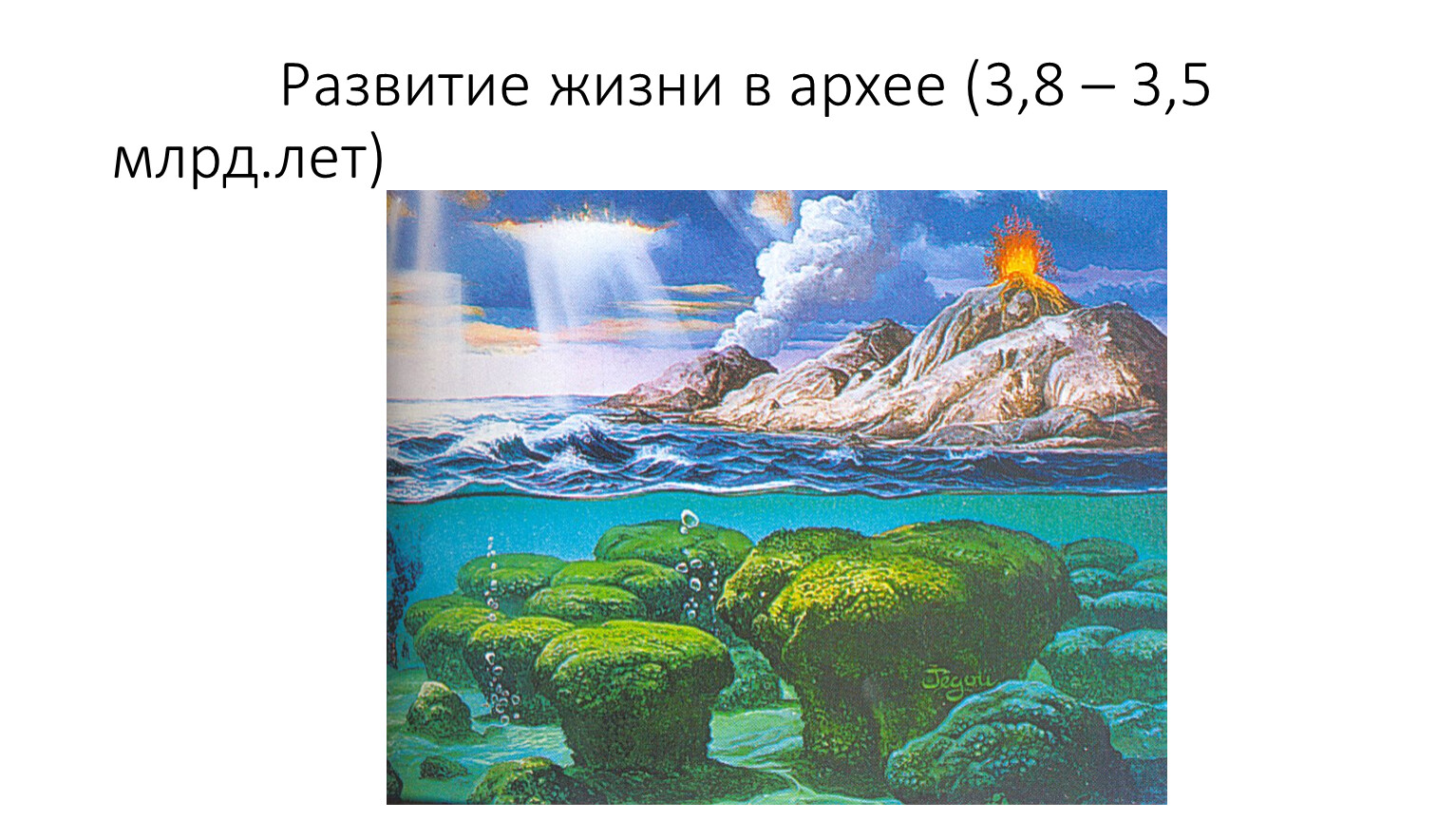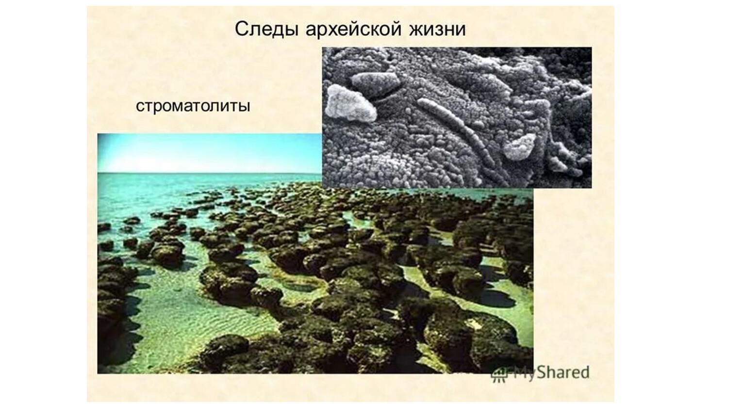 Первые организмы – архебактерии, цианобактерии. Продукты жизнедеятельности - строматолиты (известковые образования в виде столбов)