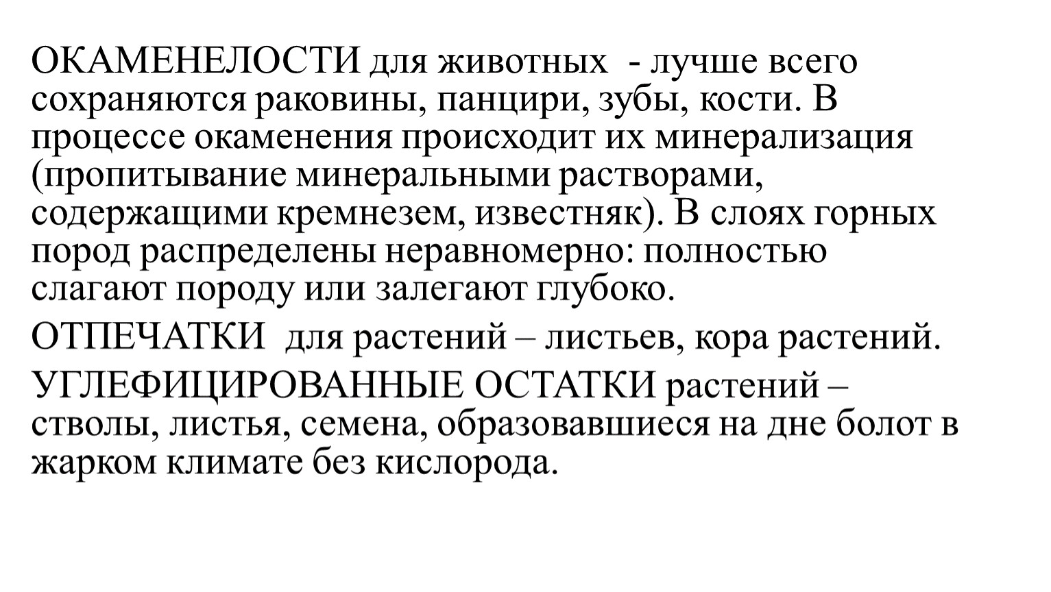 ОКАМЕНЕЛОСТИ для животных - лучше всего сохраняются раковины, панцири, зубы, кости. В процессе окаменения происходит их минерализация (пропитывание минеральными растворами, содержащими кремнезем, известняк). В слоях горных пород распределены неравномерно: полностью слагают породу или залегают глубоко.