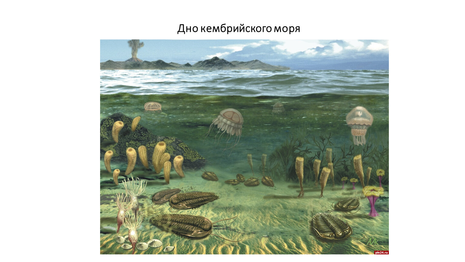 Животные – скелетные беспозвоночные: трилобиты, археоциаты (похожи на колонию полипов), губки, медузы, кораллы, морские ежи, моллюски