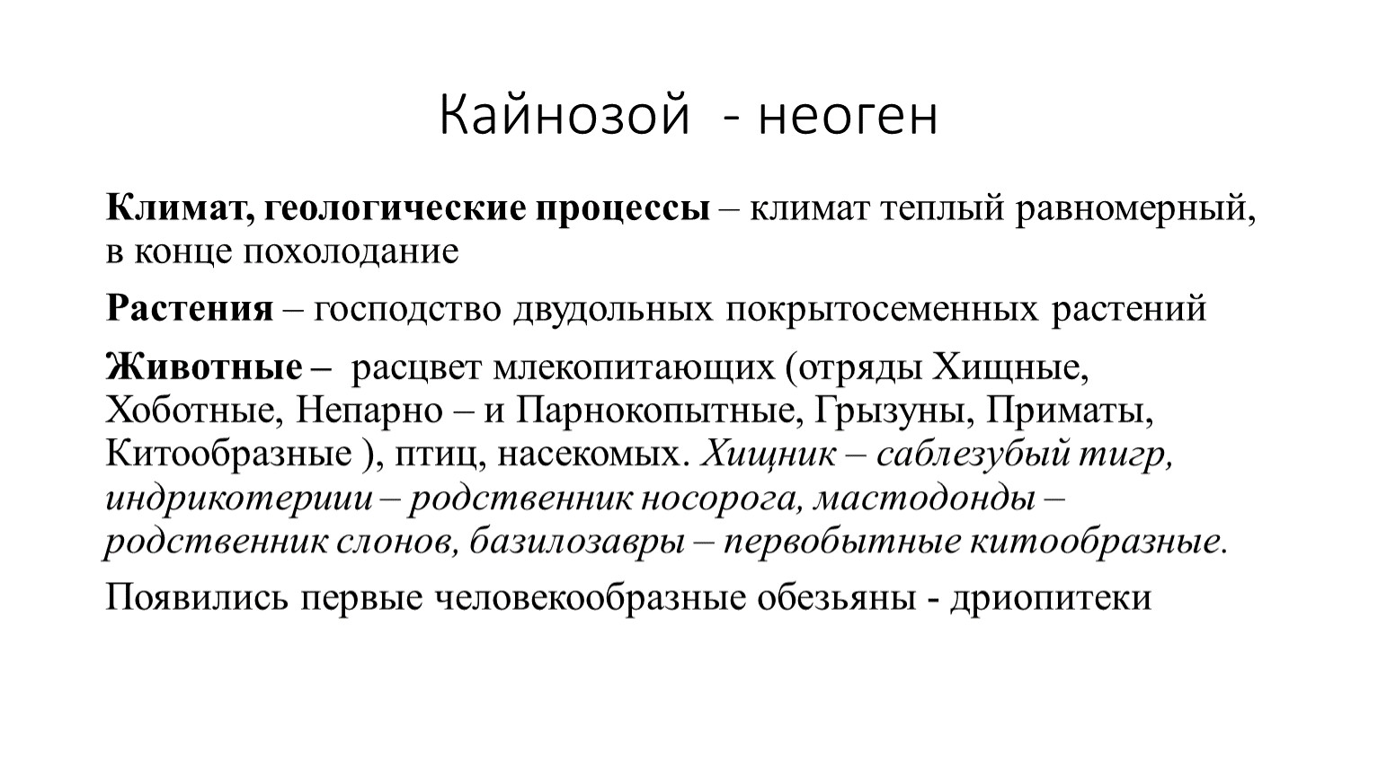 Животные – расцвет млекопитающих (отряды Хищные, Хоботные, Непарно – и Парнокопытные, Грызуны, Приматы, Китообразные ), птиц, насекомых. Хищник – саблезубый тигр, индрикотериии – родственник носорога, мастодонды – родственник слонов, базилозавры – первобытные китообразные.