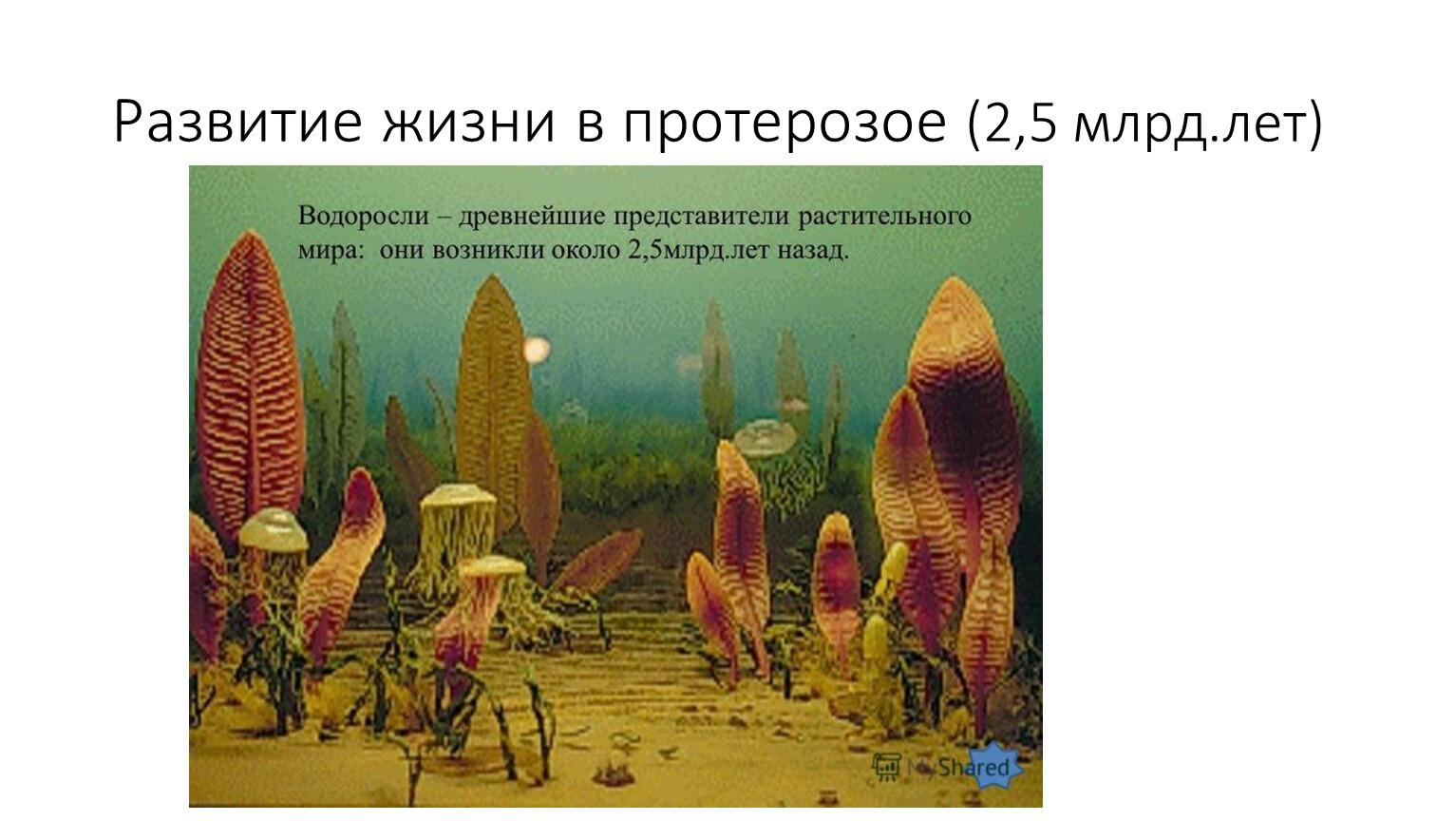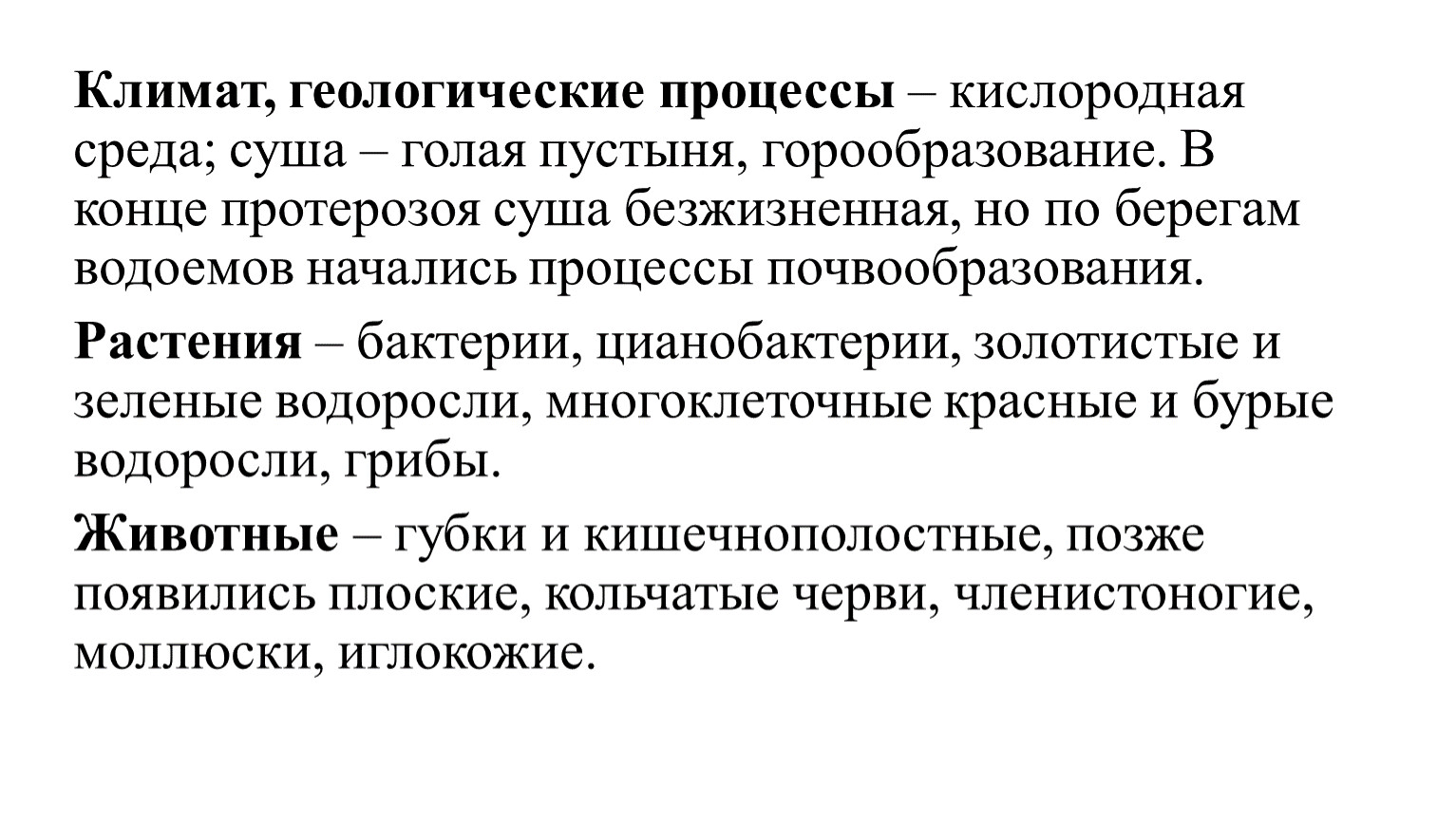 Климат, геологические процессы – кислородная среда; суша – голая пустыня, горообразование. В конце протерозоя суша безжизненная, но по берегам водоемов начались процессы почвообразования.
