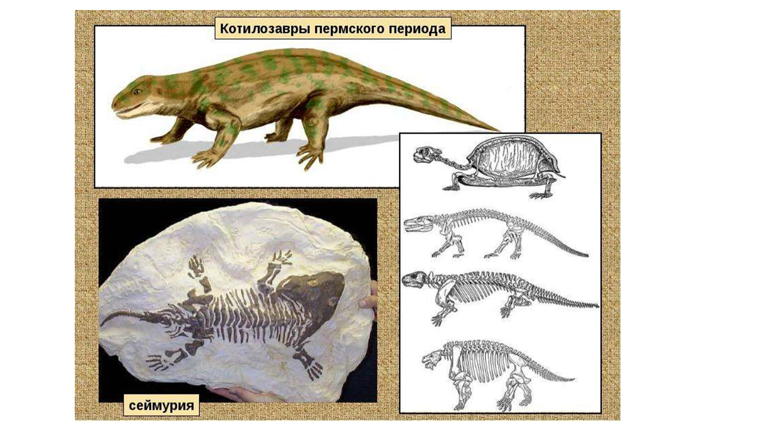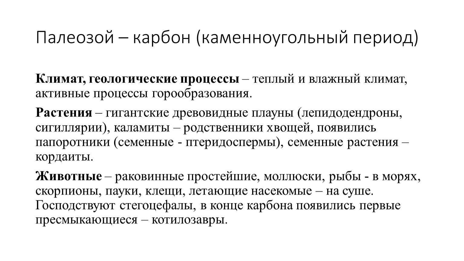 Животные – раковинные простейшие, моллюски, рыбы - в морях, скорпионы, пауки, клещи, летающие насекомые – на суше. Господствуют стегоцефалы, в конце карбона появились первые пресмыкающиеся – котилозавры.