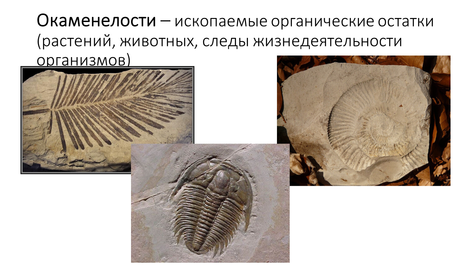 Окаменелости – ископаемые органические остатки (растений, животных, следы жизнедеятельности организмов)