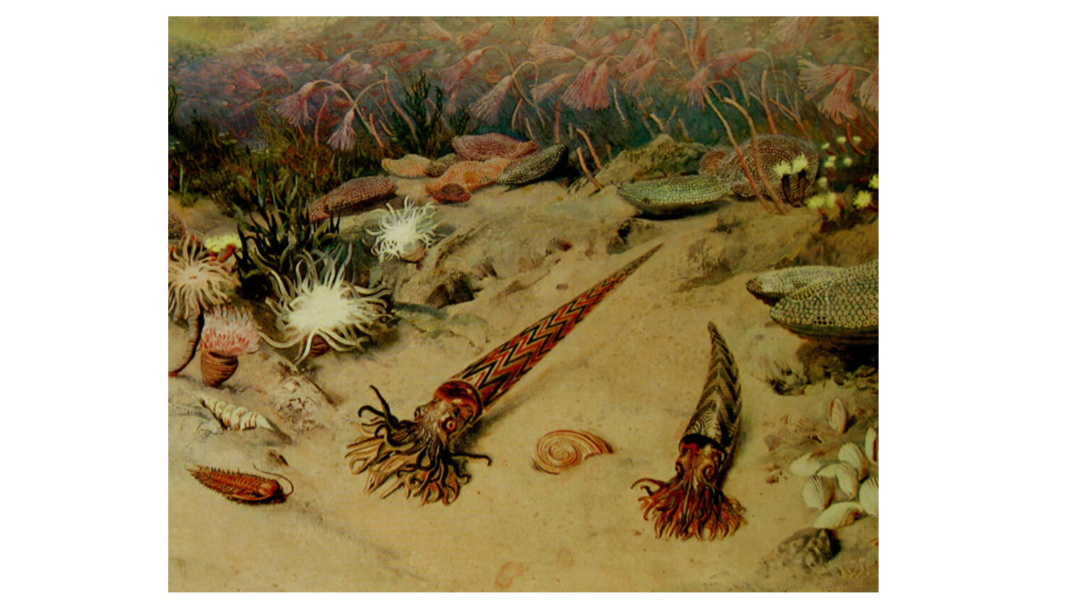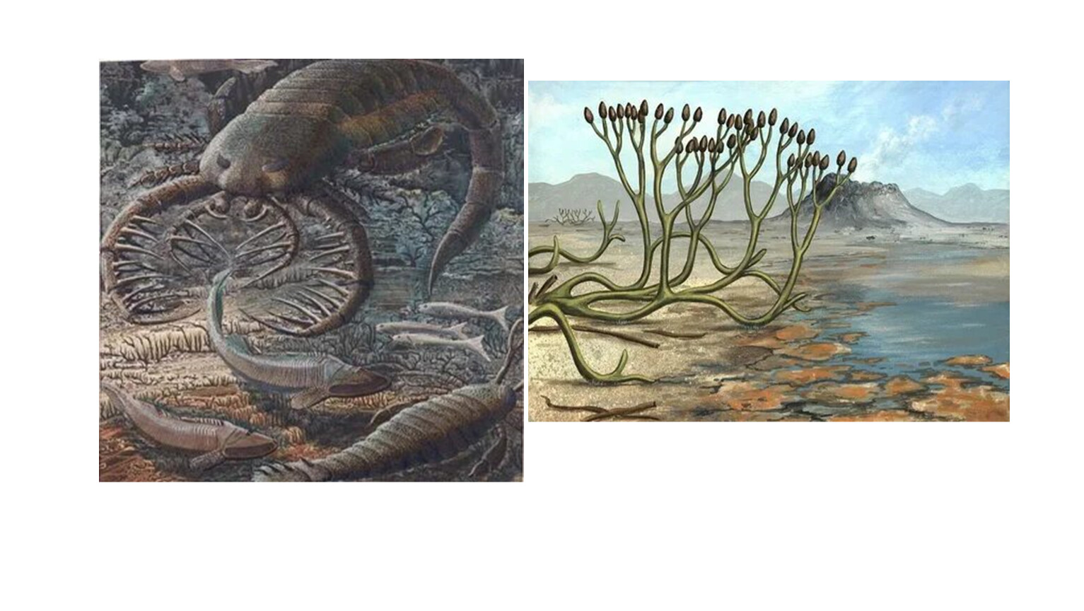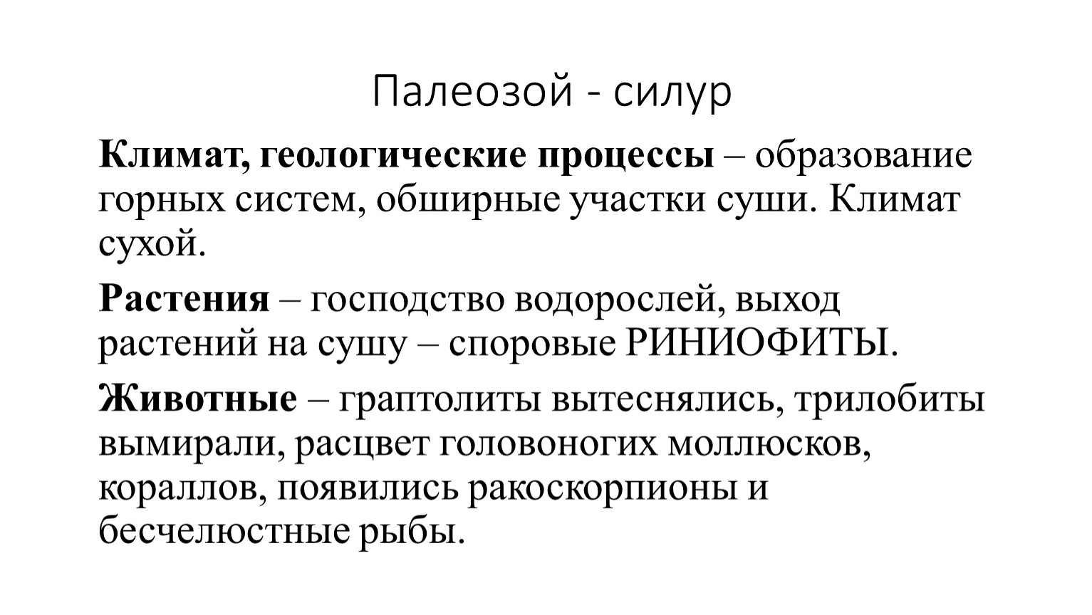 Животные – граптолиты вытеснялись, трилобиты вымирали, расцвет головоногих моллюсков, кораллов, появились ракоскорпионы и бесчелюстные рыбы.