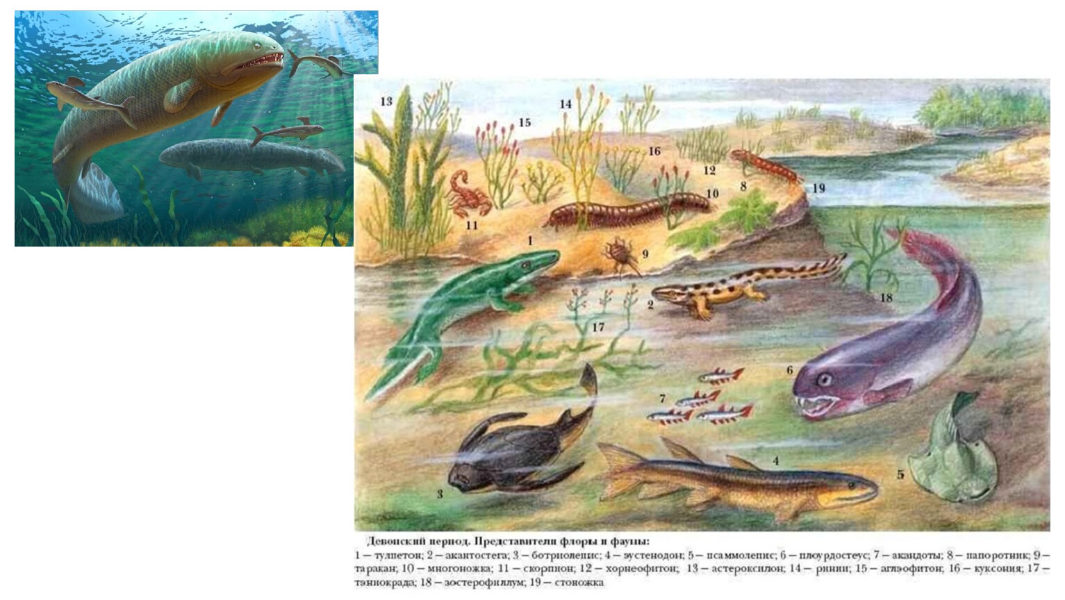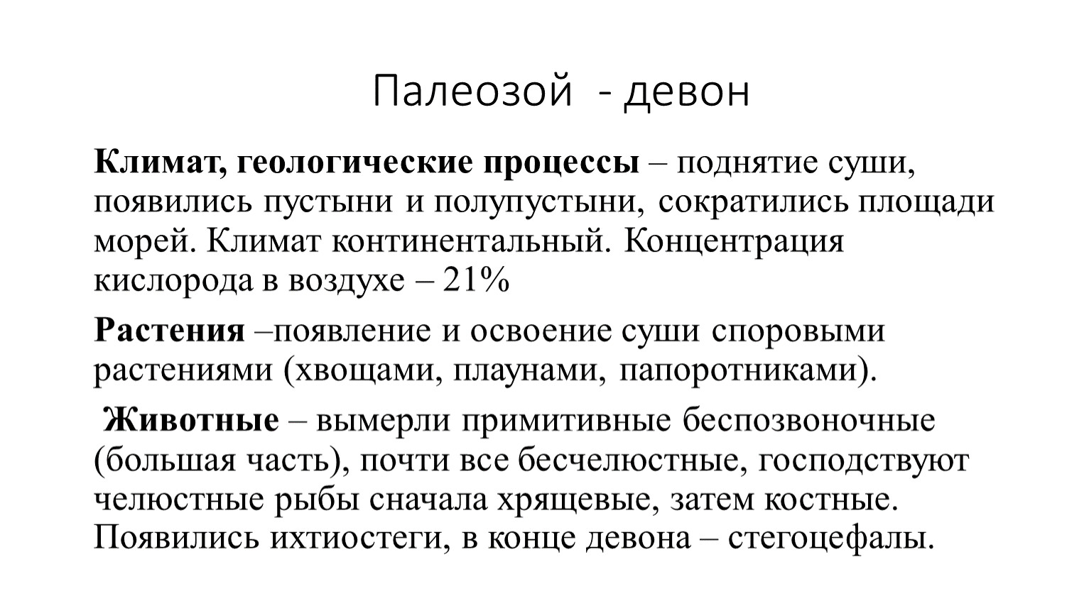 Животные – вымерли примитивные беспозвоночные (большая часть), почти все бесчелюстные, господствуют челюстные рыбы сначала хрящевые, затем костные. Появились ихтиостеги, в конце девона – стегоцефалы.