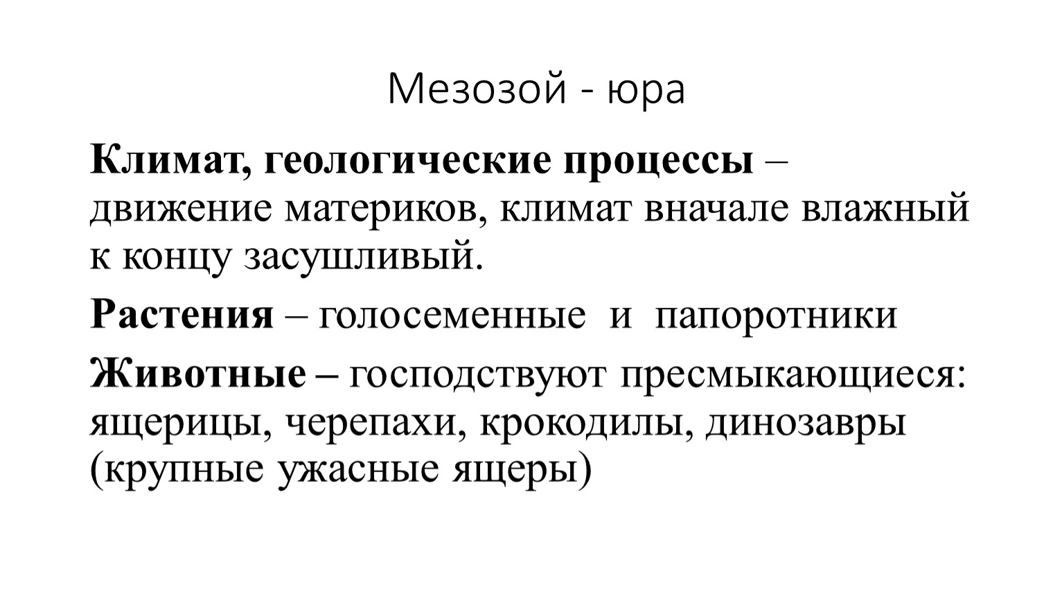 Животные – господствуют пресмыкающиеся: ящерицы, черепахи, крокодилы, динозавры (крупные ужасные ящеры)
