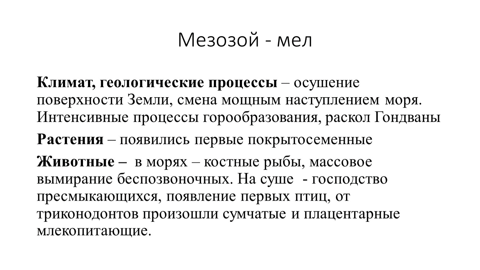 Климат, геологические процессы – осушение поверхности Земли, смена мощным наступлением моря. Интенсивные процессы горообразования, раскол Гондваны