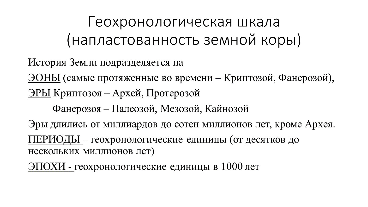 ЭОНЫ (самые протяженные во времени – Криптозой, Фанерозой),