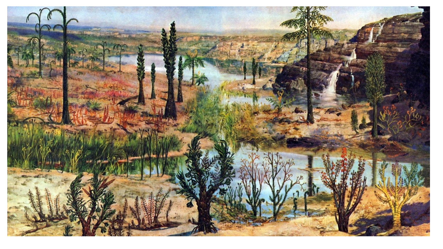 Растения –появление и освоение суши споровыми растениями (хвощами, плаунами, папоротниками).