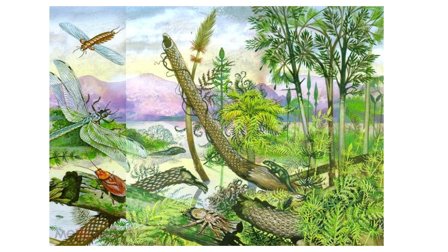 Растения – гигантские древовидные плауны (лепидодендроны, сигиллярии), каламиты – родственники хвощей, появились папоротники (семенные - птеридоспермы), семенные растения – кордаиты.