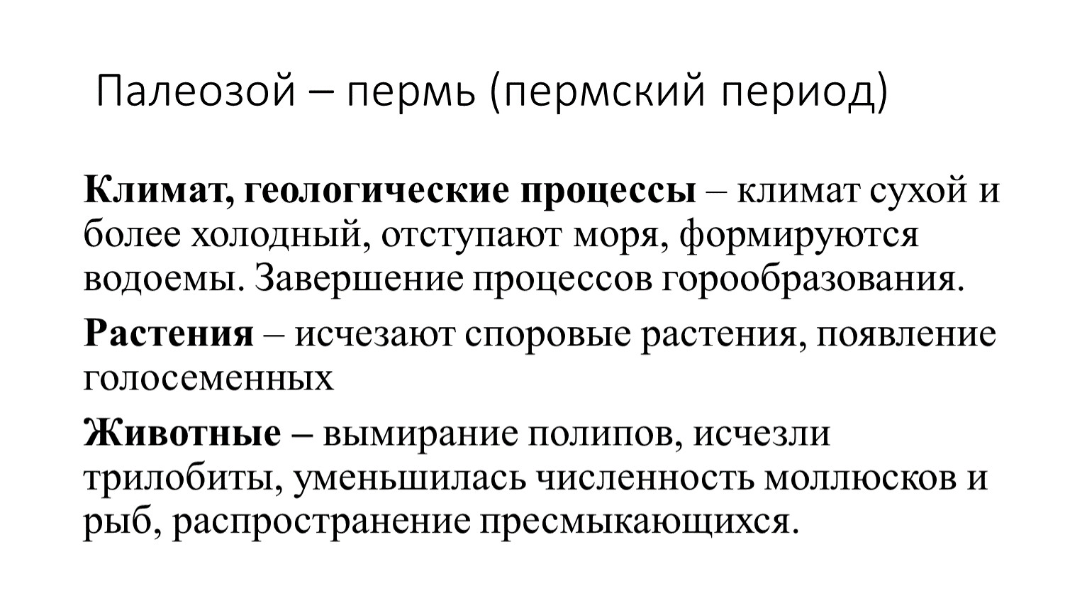 Животные – вымирание полипов, исчезли трилобиты, уменьшилась численность моллюсков и рыб, распространение пресмыкающихся.
