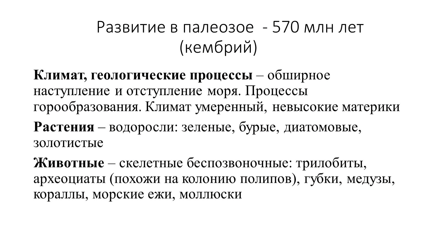 Развитие в палеозое - 570 млн лет (кембрий)
