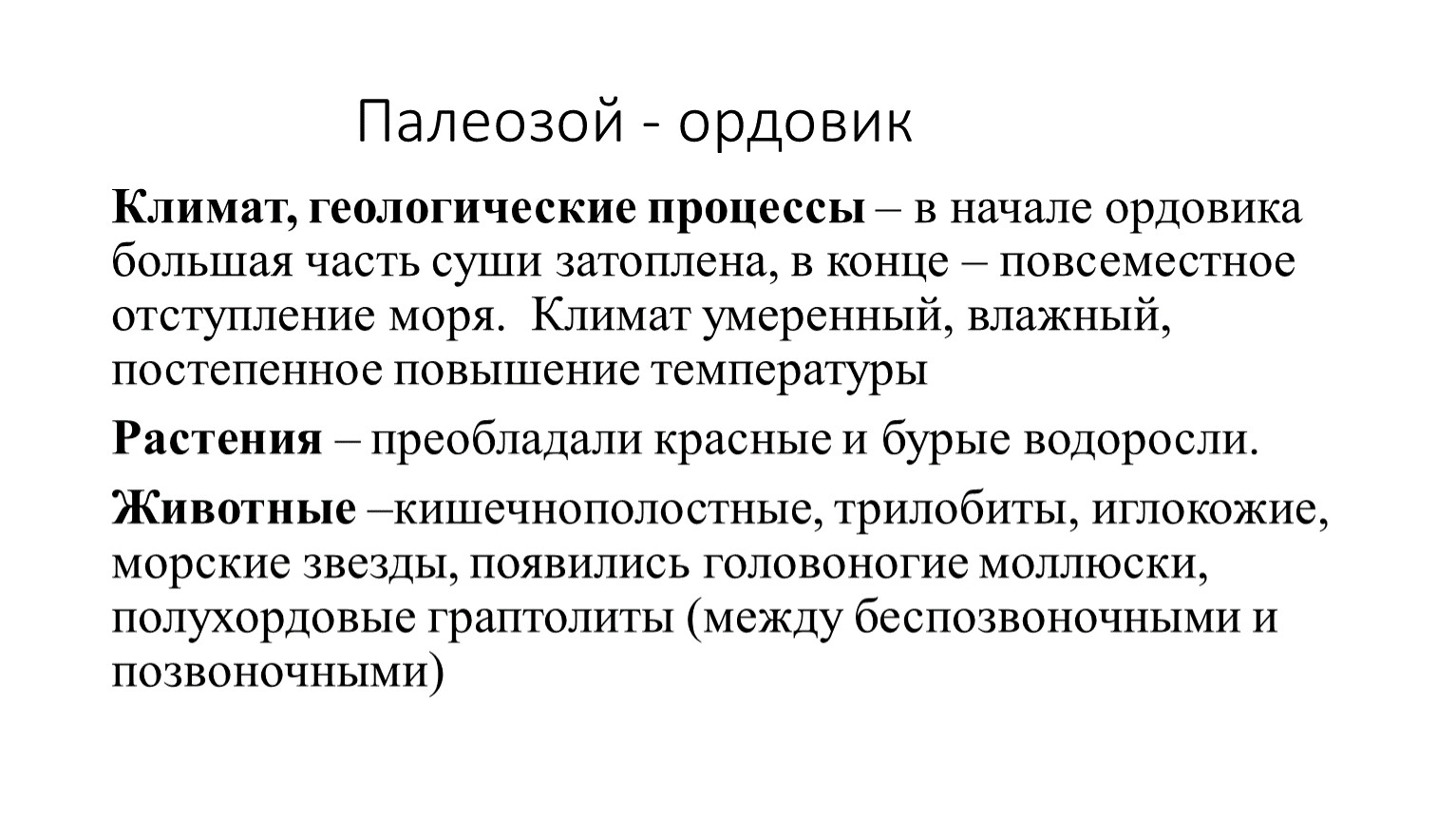 Климат, геологические процессы – в начале ордовика большая часть суши затоплена, в конце – повсеместное отступление моря. Климат умеренный, влажный, постепенное повышение температуры