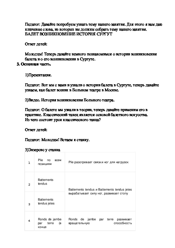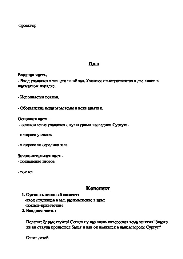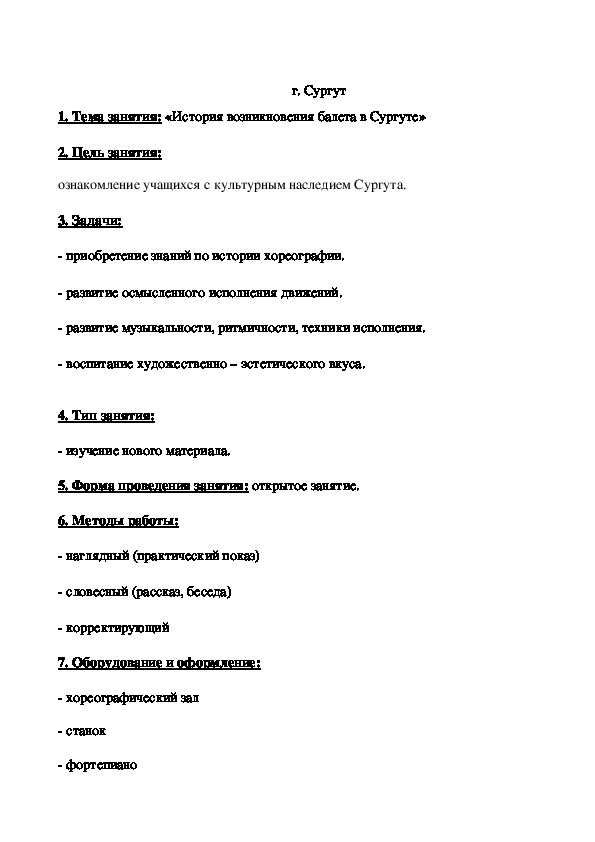 Конспект открытого занятия по хореографии. Тема занятия - История возникновения балета в Сургуте. Цель - ознакомление учащихся с культурным наследием Сургута. Задачи: приобретение знаний по истории хореографии, развитие осмысленного исполнения движений, развитие музыкальности, ритмичности, техники исполнения, воспитание художественно - эстетического вкуса.