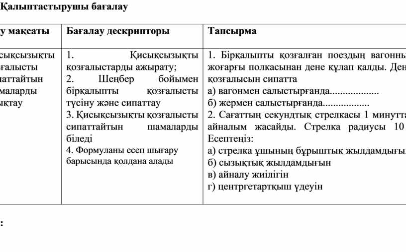 1. Бірқалыпты қозғалған поездың вагоннының жоғарғы полкасынан дене құлап қалды. Дененің қозғалысын сипатта а) вагонмен салыстырғанда................... б) жермен салыстырғанда.................. 2. Сағаттың секундтық стрелкасы 1 минутта бір айналым жасайды. Стрелка радиусы 10 см. Есептеңіз: а) стрелка ұшының бұрыштық жылдамдығын б) сызықтық жылдамдығын в) айналу жиілігін г) центргетартқыш үдеуін