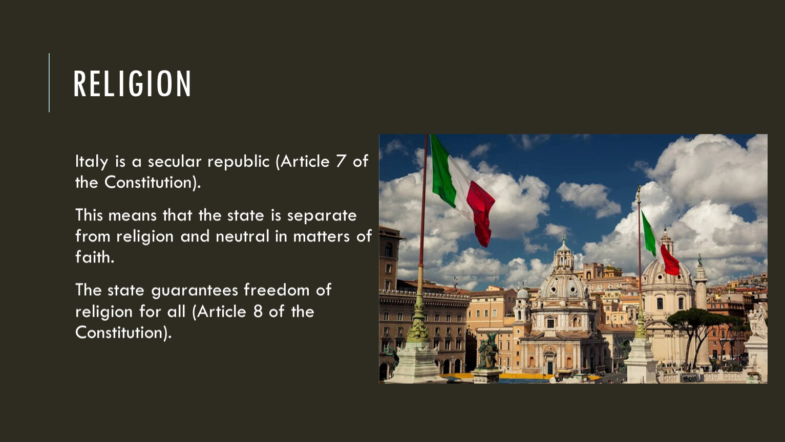 Italy is a secular republic (Article 7 of the Constitution).