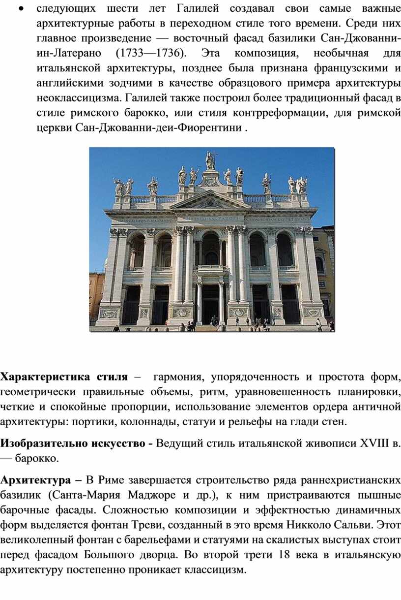 Архитектура – В Риме завершается строительство ряда раннехристианских базилик (Санта-Мария Маджоре и др.), к ним пристраиваются пышные барочные фасады. Сложностью композиции и эффектностью динамичных форм выделяется фонтан Треви, созданный в это время Никколо Сальви. Этот великолепный фонтан с барельефами и статуями на скалистых выступах стоит перед фасадом Большого дворца. Во второй трети 18 века в итальянскую архитектуру постепенно проникает классицизм.