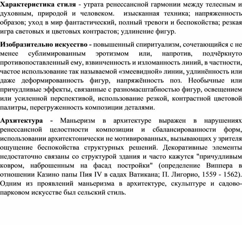 Характеристика стиля - утрата ренессансной гармонии между телесным и духовным, природой и человеком. изысканная техника; напряженность образов; уход в мир фантастический, полный тревоги и беспокойства; резкая игра световых и цветовых контрастов; удлинение фигур.