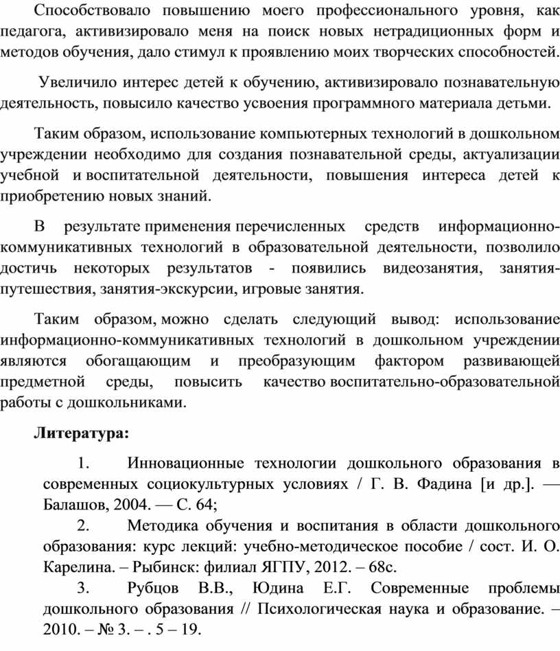 1. Инновационные технологии дошкольного образования в современных социокультурных условиях / Г. В. Фадина [и др.]. — Балашов, 2004. — С. 64;