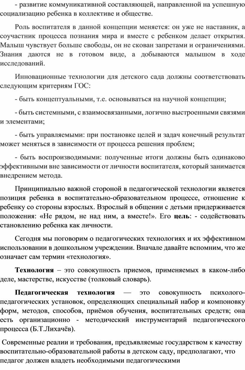 Инновационные технологии для детского сада должны соответствовать следующим критериям ГОС:
