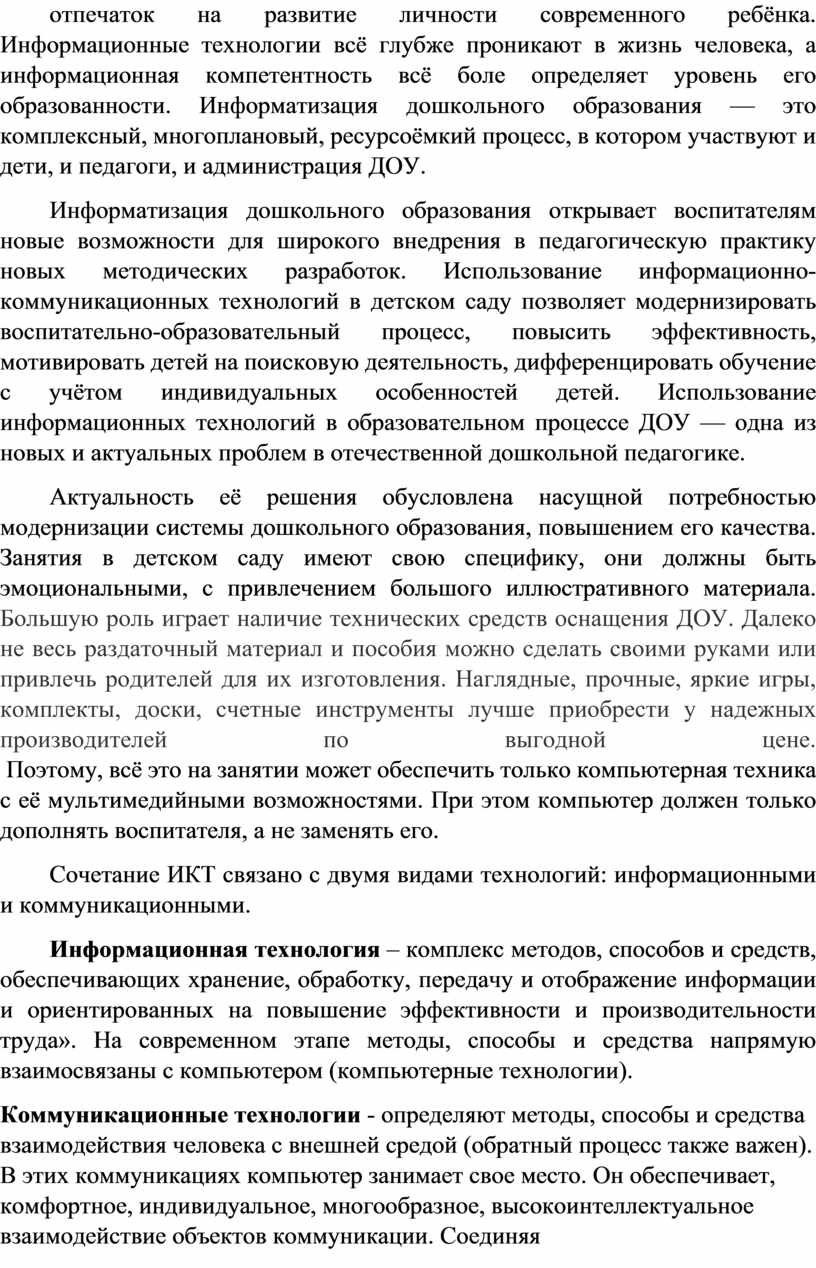 В последнее время во многих странах происходит бурное развитие новых информационных технологий, что накладывает определённый отпечаток на развитие личности современного ребёнка. Информационные технологии всё глубже проникают в жизнь человека, а информационная компетентность всё боле определяет уровень его образованности. Информатизация дошкольного образования — это комплексный, многоплановый, ресурсоёмкий процесс, в котором участвуют и дети, и педагоги, и администрация ДОУ.