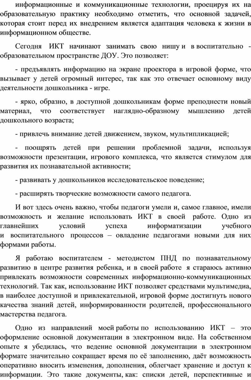 Информатизация дошкольного образования открывает воспитателям новые возможности для широкого внедрения в педагогическую практику новых методических разработок. Использование информационно-коммуникационных технологий в детском саду позволяет модернизировать воспитательно-образовательный процесс, повысить эффективность, мотивировать детей на поисковую деятельность, дифференцировать обучение с учётом индивидуальных особенностей детей. Использование информационных технологий в образовательном процессе ДОУ — одна из новых и актуальных проблем в отечественной дошкольной педагогике.