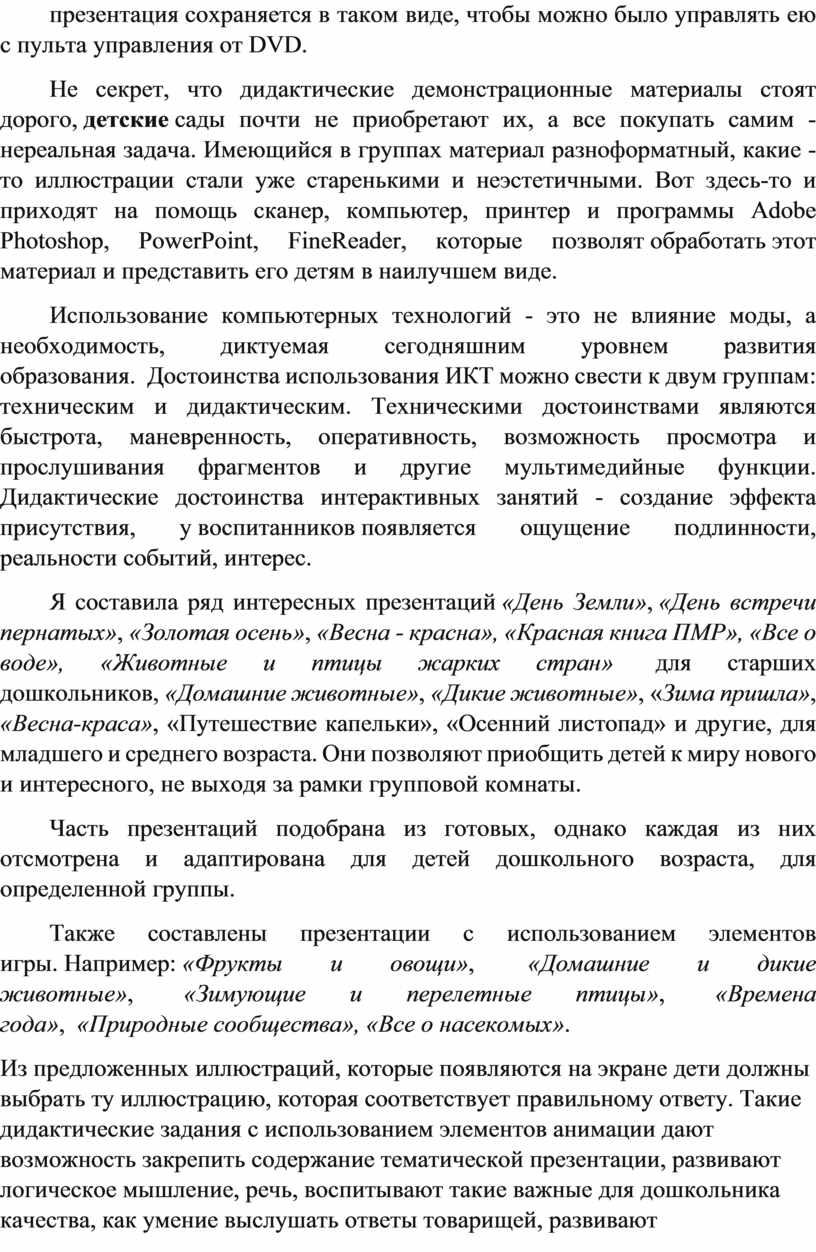 Не секрет, что дидактические демонстрационные материалы стоят дорого, детские сады почти не приобретают их, а все покупать самим - нереальная задача. Имеющийся в группах материал разноформатный, какие -то иллюстрации стали уже старенькими и неэстетичными. Вот здесь-то и приходят на помощь сканер, компьютер, принтер и программы Adobe Photoshop, PowerPoint, FineReader, которые позволят обработать этот материал и представить его детям в наилучшем виде.