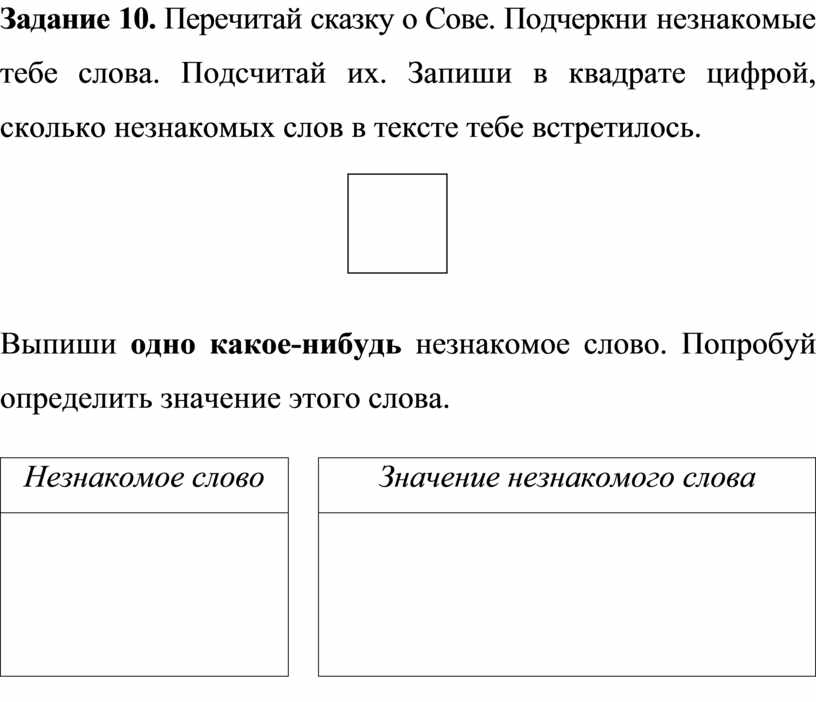 Задание 10. Перечитай сказку о Сове. Подчеркни незнакомые тебе слова. Подсчитай их. Запиши в квадрате цифрой, сколько незнакомых слов в тексте тебе встретилось.
