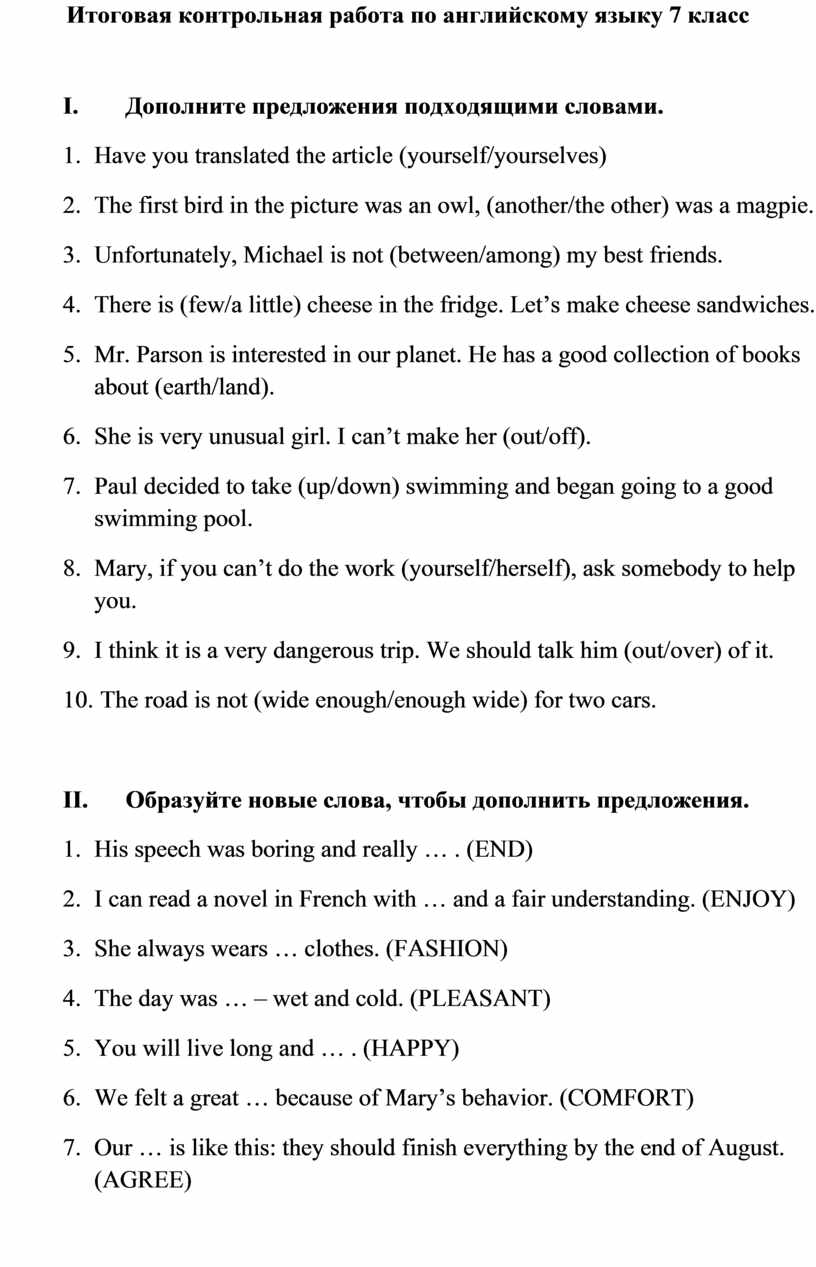 I. 1. yourself 2. the other 3. among 4. a little 5. earth 6. out 7. up 8. yourself 9. out 10. wide enough II. 1. endless 2. enjoyment 3. fashionable 4. unpleasant 5. happily 6. discomfort 7. agreement III. 1. E 2. A 3. D 4. B 5. C IV. 1. E 2. A 3. B 4. C 5. D