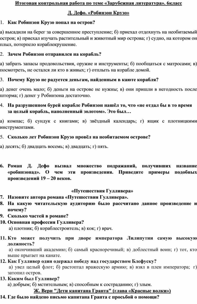 Итоговая контрольная работа по теме «Зарубежная литература». 6класс