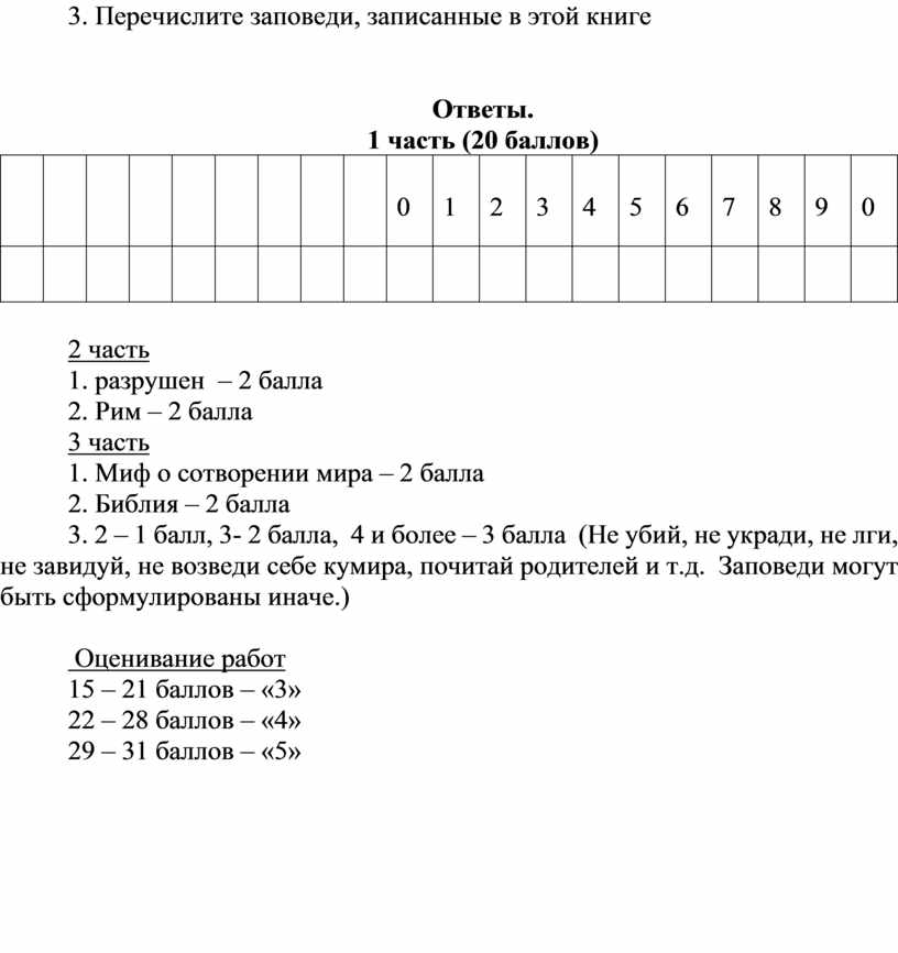 3. 2 – 1 балл, 3- 2 балла, 4 и более – 3 балла (Не убий, не укради, не лги, не завидуй, не возведи себе кумира, почитай родителей и т.д. Заповеди могут быть сформулированы иначе.)