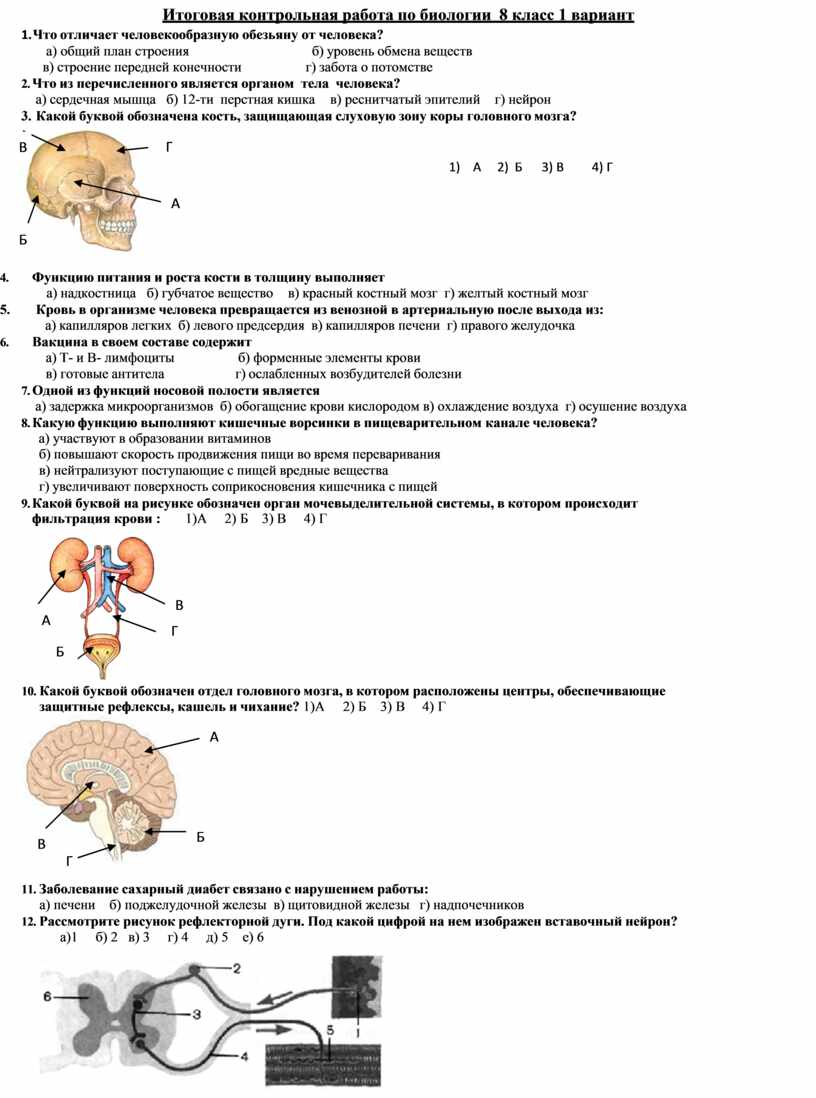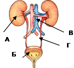 9. Какой буквой на рисунке обозначен орган мочевыделительной системы, в котором происходит фильтрация крови : 1)А 2) Б 3) В 4) Г
