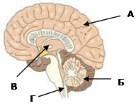10. Какой буквой обозначен отдел головного мозга, в котором расположены центры, обеспечивающие защитные рефлексы, кашель и чихание? 1)А 2) Б 3) В 4) Г
