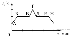 4. На рисунке представлен график зависимости температуры t от времени τ при равномерном нагревании и последующем равномерном охлаждении вещества, первоначально находящегося в твѐрдом состоянии.
