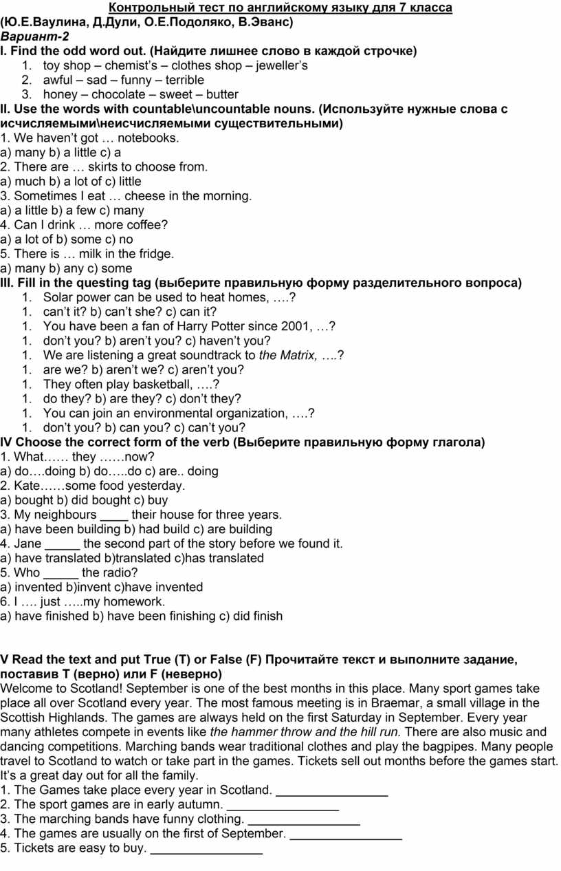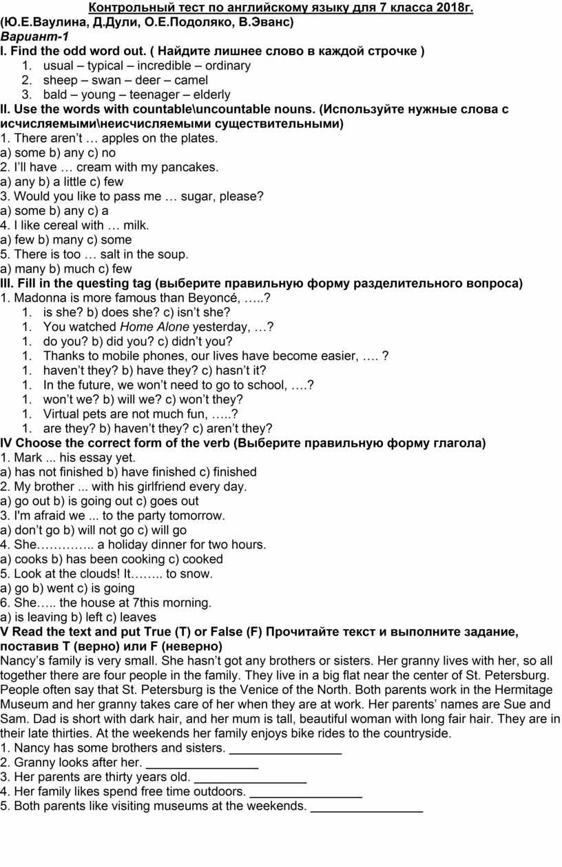 Контрольный тест по английскому языку для 7 класса 2018г.