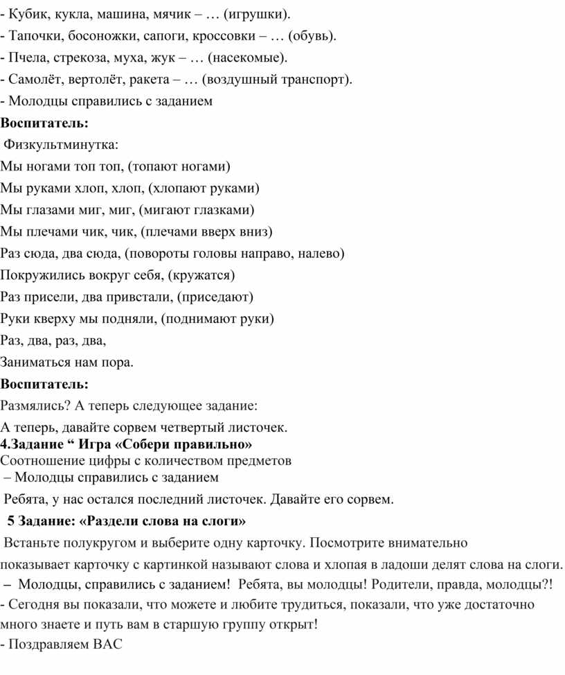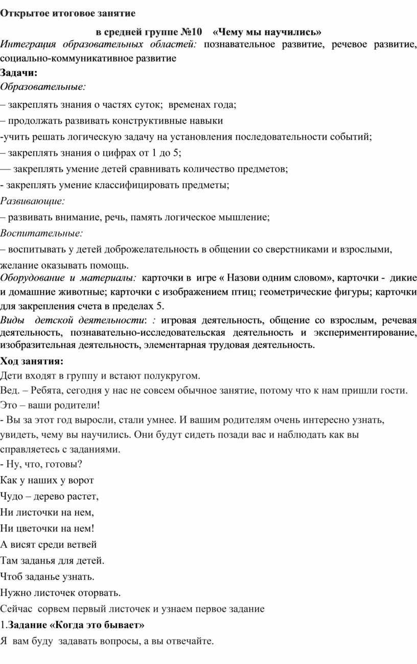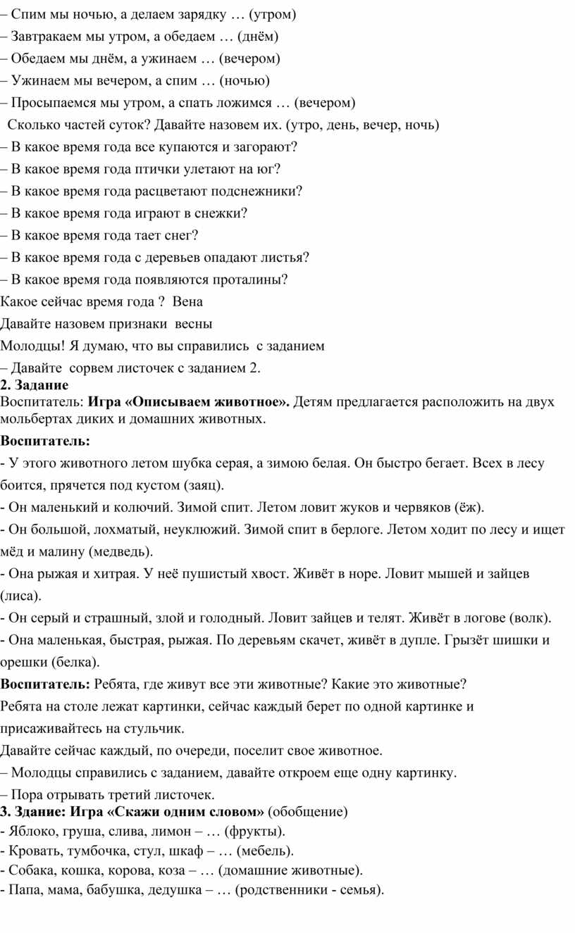 – закреплять знания о частях суток; временах года;